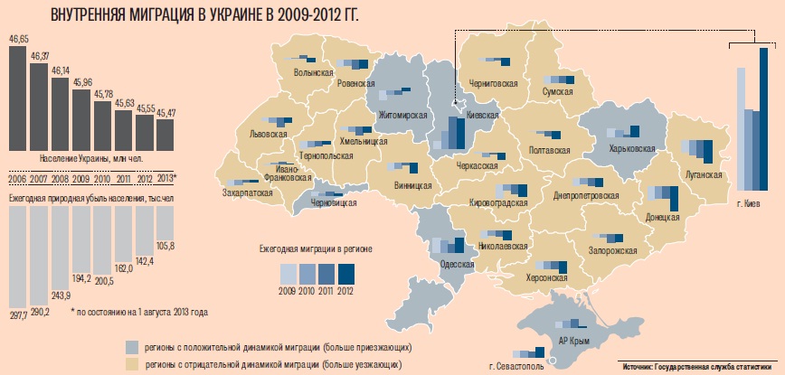 На графике, отражающем межрегиональные миграции украинцев, видно, что население Киева и Киевской области постоянно увеличивалось с 2006 по 2012 г. Здесь в прошлом году за счет новых жителей из других регионов Украины прибавилось почти 22 тыс. человек.