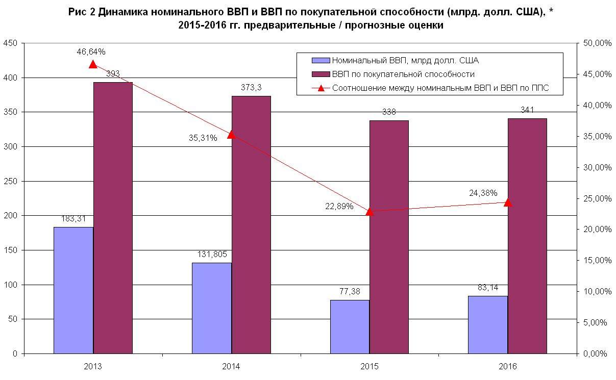 Как показывают предварительные оценки, ВВП в долларах США, посчитанный по покупательной способности, упал в 2015 году не так уж и сильно с 373,3 млрд долл. США до 338 млрд долл. США (рис. 2).