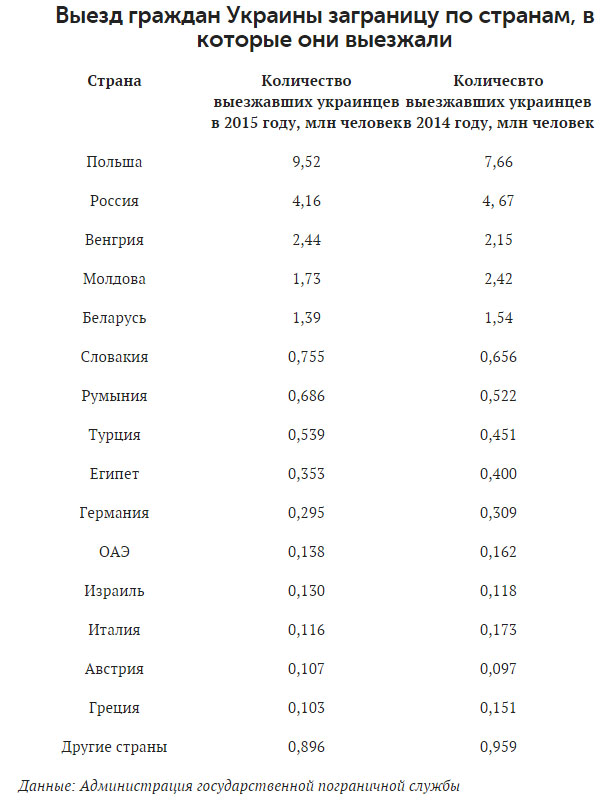 В структуре выездного потока, как и в прошлом году, уверенно лидирует Польша. В эту страну выезжали 9,52 млн человек, что почти на четверть больше, чем в 2014 году (7,66 млн человек). Пендзин напоминает, что Польша ввела достаточно благоприятный режим для украинских трудовых мигрантов, который в ближайшее время может быть еще более либерализирован.