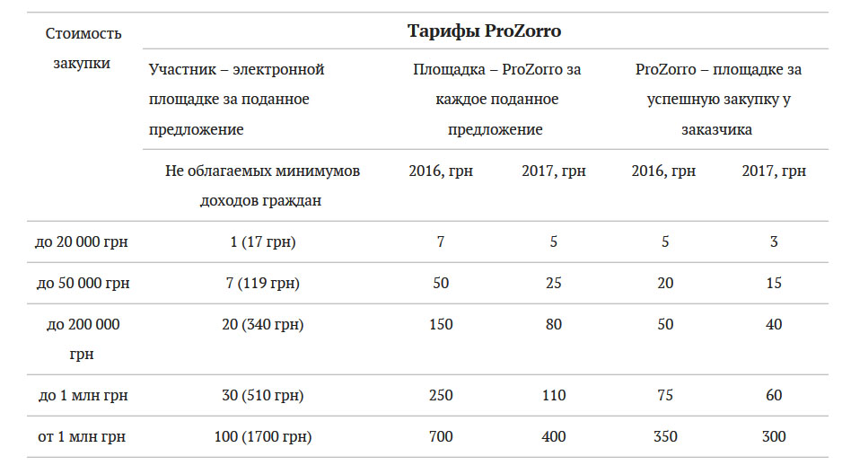 Далее ProZorro вводит шкалу тарифов за пользование системой и доступ к электронному модулю аукционов. Всего в системе три вида расчетов: плата от поставщика электронной площадке за каждое предложение, поданное на торги; плата площадки системе ProZorrо за доступ к базе данных; плата ProZorrо площадке за успешное проведение торгов.