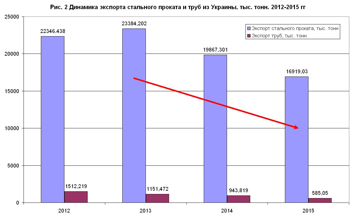 Если сравнивать с 2013 годом, то в 2015 году экспорт стального проката в Украине упал на 27,65%, а экспорт труб — на 49,19%. По трубной отрасли и по производителям проката был, конечно же, нанесен серьезный удар. Удар немного смягчили производители ЖРС, у которых экспорт в физических единицах практически не падал. Однако именно падение экспорта в физических единицах в сегменте высокого передела в ГМК показывает реальное состояние экспорта отрасли. Если сравнивать с 2014/2015 гг., то экспорт стального проката упал на 14%, а труб — на 38%.