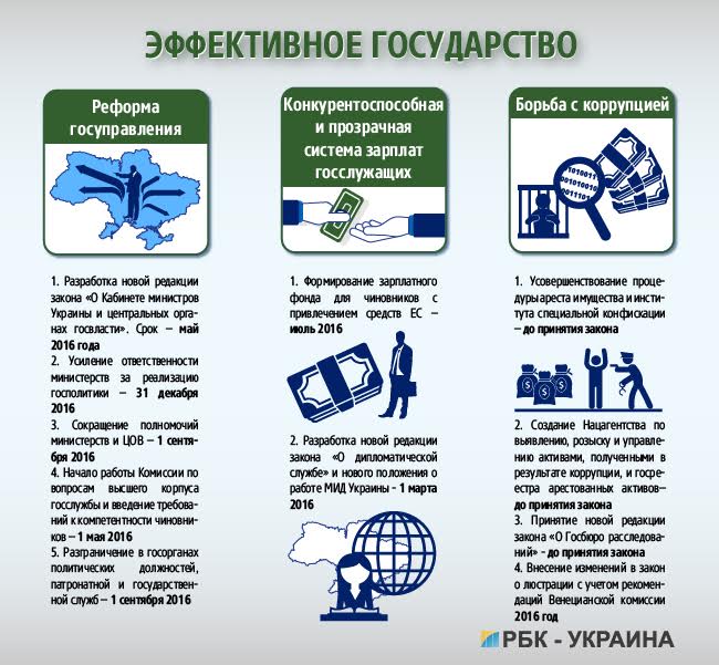 «Ресурс не мощный, у нас не прошла реформа публичной администрации, имеется ввиду госслужбы и структур, — поясняет Клименко. — Нужна свежая кровь, новые люди. Это должна была быть реформа № 1. Без реформирования изнутри что-то сложно делать, так как остаются старые люди». Кроме того, соглашается она с Забловским, многие реформы зависят от решений парламента, например, вопросы приватизации, корпоративного управления, дерегуляция и развитие государственного частного партнерства.