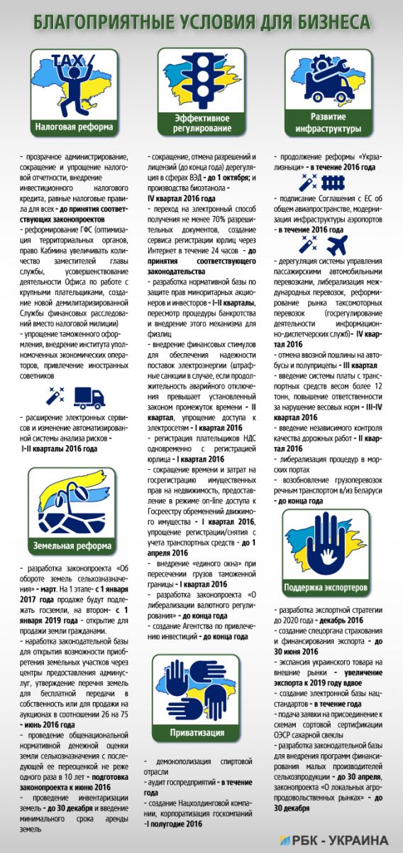 Деятельность Кабмина по упрощению работы бизнеса содержит наибольшее количество предложений. В черновом варианте программы этот блок чиновники назвали Easy Business. Помимо поддержки экспортеров, дерегуляции, развития инфраструктуры и электронных сервисов, правительство в условиях кризиса не отказывается от идей приватизации и открытия рынка сельхозземель. В то же время, чиновники не замечают необходимости проведения масштабной налоговой реформы, а намерены лишь реформировать структуру ГФС.