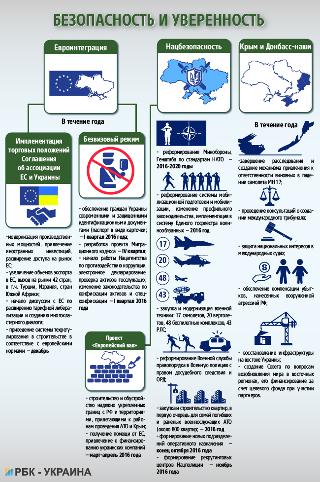 В сфере нацбезопасности и обороны правительство намерено продолжить модернизацию и закупку военной техники, а также реформировать систему мобилизационной подготовки. Одно из направлений — создание Военной полиции с правом ОРД и досудебного следствия. Кабмин также не оставляет попыток вернуть оккупированные территории и интегрировать Украину в ЕС.