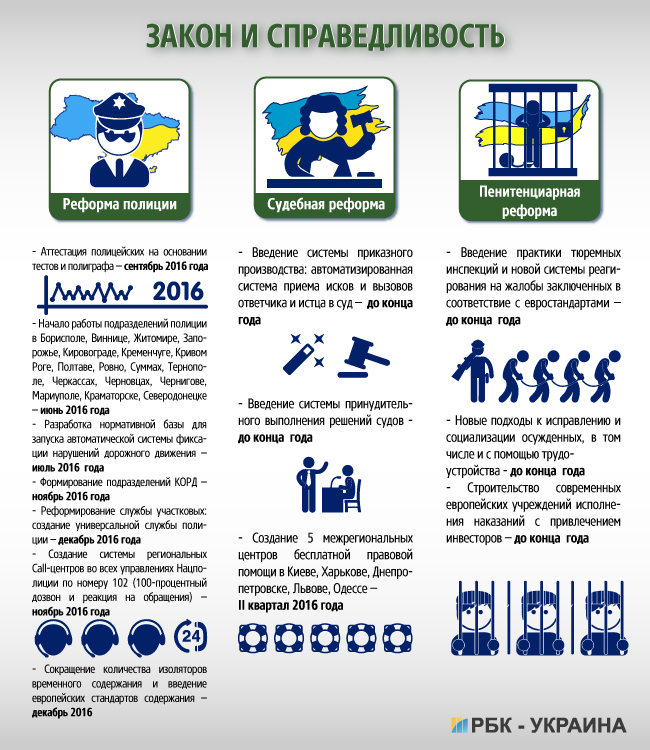 В Кабмине обещают, что в 2016 году реформа полиции будет продолжаться. Например, планируется создать универсальную службу участковых и новый call-центр на базе 102. Кроме того, министры намерены реализовать судебную реформу, в частности, ввести систему принудительного выполнения решений судов.