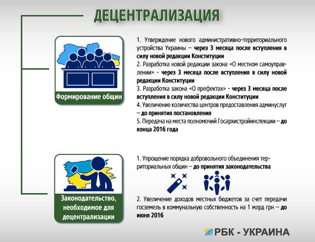 Децентрализацию в Кабмине считают залогом «национального успеха». Впрочем, блок содержит мало конкретики. Эффективность реализации планов по децентрализации во многом будет зависеть от принятия новой редакции Конституции в части изменения административно-территориального устройства страны.