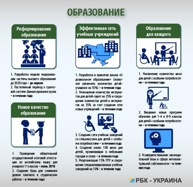 Образование для Кабмина — «основа новой страны». Но, несмотря на это, чиновники продолжат политику оптимизации количества учебных заведений. Например, речь идет о сокращении числа интернатов для детей-сирот, а также ПТУ. В этом, в частности, «обновленное содержание образования».