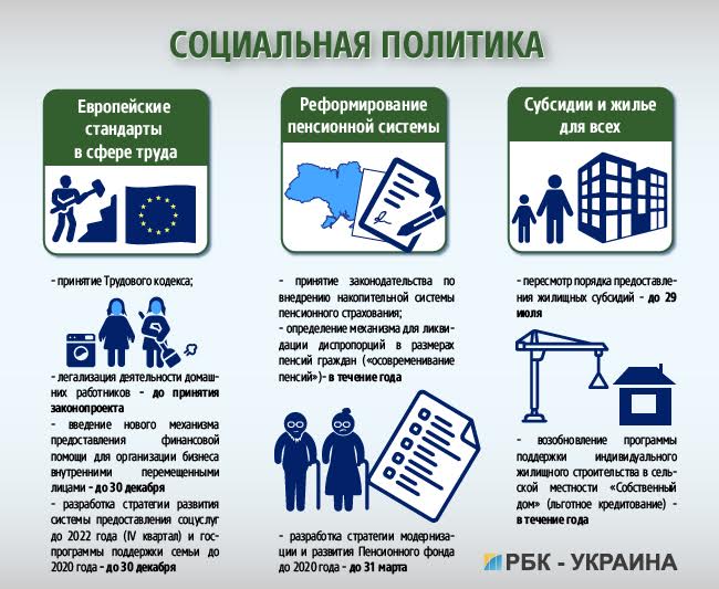 Реформы в социальной сфере представляются Кабмину в основном в виде написания стратегий и концепций. Достаточно неконкретно выписаны пенсионная реформа и политика занятости населения. К середине лета Минсоцполитики намерено пересмотреть порядок получения жилищных субсидий, однако в чем суть изменений пока не ясно.