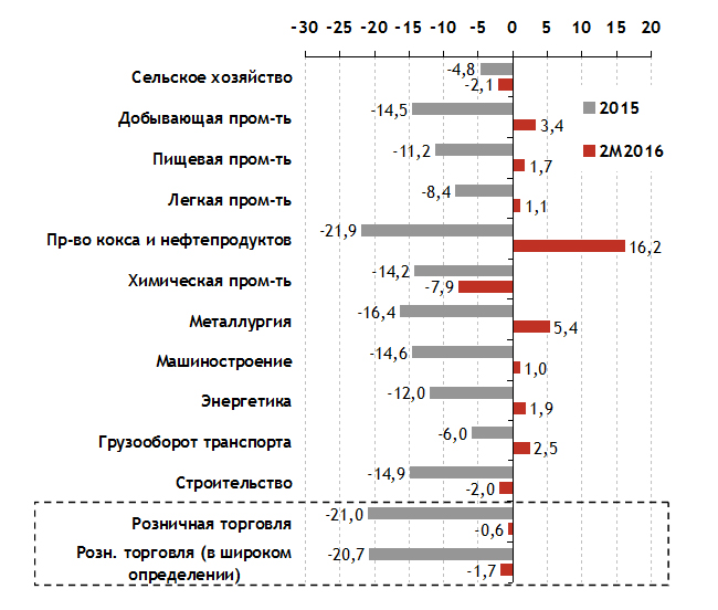 Восстановление роста происходит не только в промышленности. В феврале зафиксировано также и увеличение объемов строительства и транспортных грузоперевозок. Благодаря замедлению инфляции падение розничных продаж уже составляет не 21% (результат 2015 года), а 1,5%. В данный момент динамика этой огромной отрасли также переходит в область положительных значений.