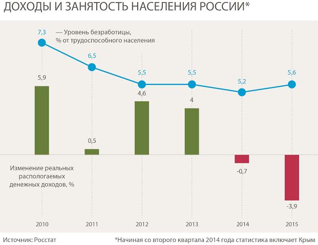 Начнём с того, что прямо ощущает каждый житель страны — собственных доходов. Реальные (то есть с учётом инфляции) располагаемые доходы среднестатистического россиянина за 9 месяцев 2015 года упали на 3,9%, тогда как в 2010–2013 годах они росли среднегодовым темпом 4–6%.