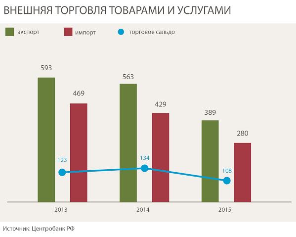 Внимательный читатель скажет, что продолжается сокращение российского экспорта. Это так: за последние два года вывоз товаров и услуг из РФ упал на 34%. Однако импорт ужался ещё больше — на 40%. От покупки сибирско-заполярных энергоносителей мир отнюдь не отказался, а потому положительный торговый баланс в размере $100 млрд у России сохранился.