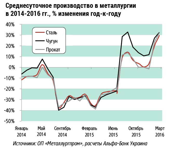 Производство в отечественной металлургии в последние месяцы уверенно растет. В марте 2016 года был достигнут локальный максимум, которого не удалось добиться с августа 2014 года, когда военные действия обрушили выпуск металла.