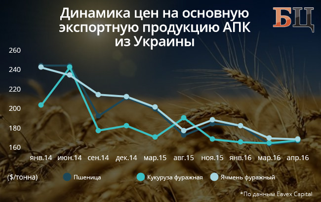 В первом квартале 2016 года экспортные цены на пшеницу и фуражный ячмень из Украины снизились на 6% — до $172 и $174 за тонну соответственно. Тонна фуражной кукурузы на внутреннем рынке подорожала на 4% — до $120. Цены на экспортную кукурузу практически не изменились. В первом квартале тонна подорожала на один доллар — до $167,2.