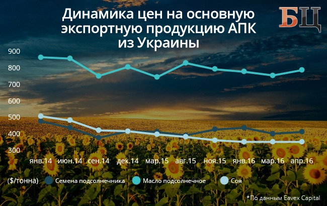 Так в первые три месяца 2016 года семена подсолнечника подешевели на 1% — до 426,5 за тонну. Стоимость тонны масла подсолнечного нерафинированного снизилась на 2% — до $781. Экспортная цена на украинскую сою в первом квартале также снизилась на 2% — до $356 за тонну.