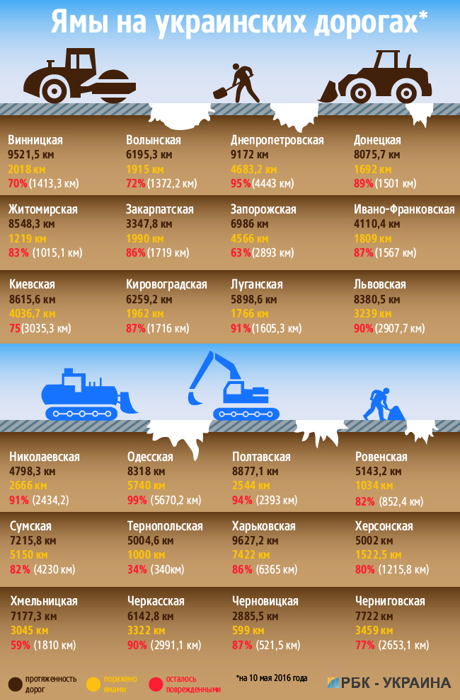 Ямы и выбоины — основная проблема украинских дорог. По подсчетам Укравтодора, ямами покрыто около 42% или 68,4 тыс. км всех трасс в стране. За полученные средства дорожные службы успели привести в порядок лишь 17% автодорог.