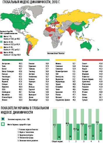 В глобальном рейтинге по уровню динамичности экономического развития Украина оказалась на 56‑м месте среди 60 стран. Об этом свидетельствуют результаты второго ежегодного исследования «Глобальный индекс динамичности 2013», проведенного международной экспертной сетью Grant Thornton. Цель — оценить изменения в экономике стран мира, которые позволили им преодолеть глобальный экономический кризис 2008‑2009 гг. и, вероятно, приведут к быстрым темпам развития в будущем. В ходе исследования были опрошены 406 руководителей высшего звена.