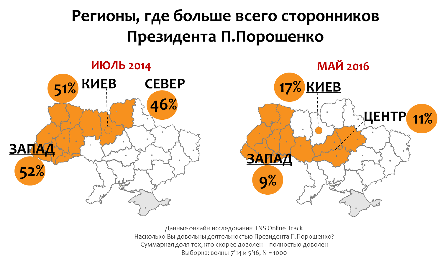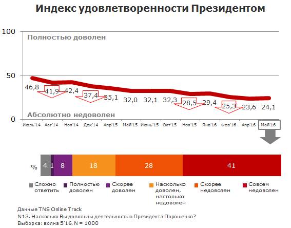 Данные онлайн исследования TNS Online Track свидетельствуют, что индекс удовлетворенности президентом Петром Порошенко на посту за два года упал почти вдвое — начиная с июля 2014 наметилась стабильная тенденция к его постепенному медленному снижению. За второй год индекс удовлетворенности Президентом упал на 8 пунктов.