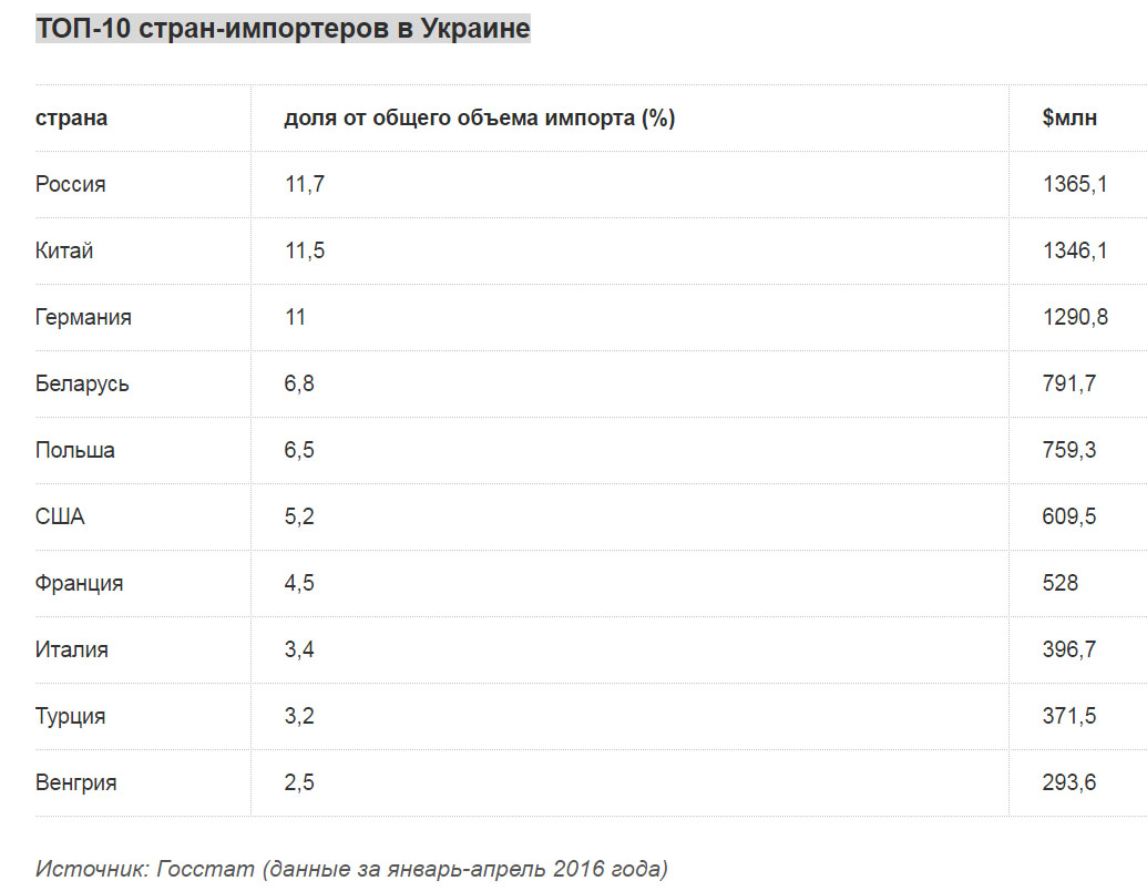Кто импортирует в Украину. Львиную долю продукции в Украины завозят из тех же стран, куда идет больше всего экспортных поставок, — России (11,7%) и Китая (11,5%). Третье место занимает Германия (11%), за ней следуют Беларусь (6,8%) и Польша (6,5). Причем в прошлом году в первые четыре месяца Германия опережала Китай по объемам импорта, а доля России была несколько больше — около 16,2%. В январе-апреле 2014 года российский импорт занимал 28,6% от объема поставок товаров в Украину. В денежном выражении импорт из РФ в январе-апреле «просел» более чем на $0,5 млрд.