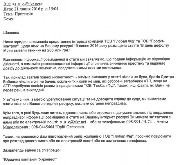 На днях в редакции многих изданий пришло письмо от юридической компании «Укринвест», представляющей интересы «Профит Контроль» и «Глобал Фид».