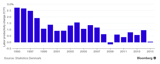 Альтернативой сокращения издержек, несомненно, является увеличение доходов. Но здесь у Дании дела тоже идут не очень — низкая продуктивность труда не дает расти экономике, которая сейчас демонстрирует результаты хуже, чем в странах еврозоны.