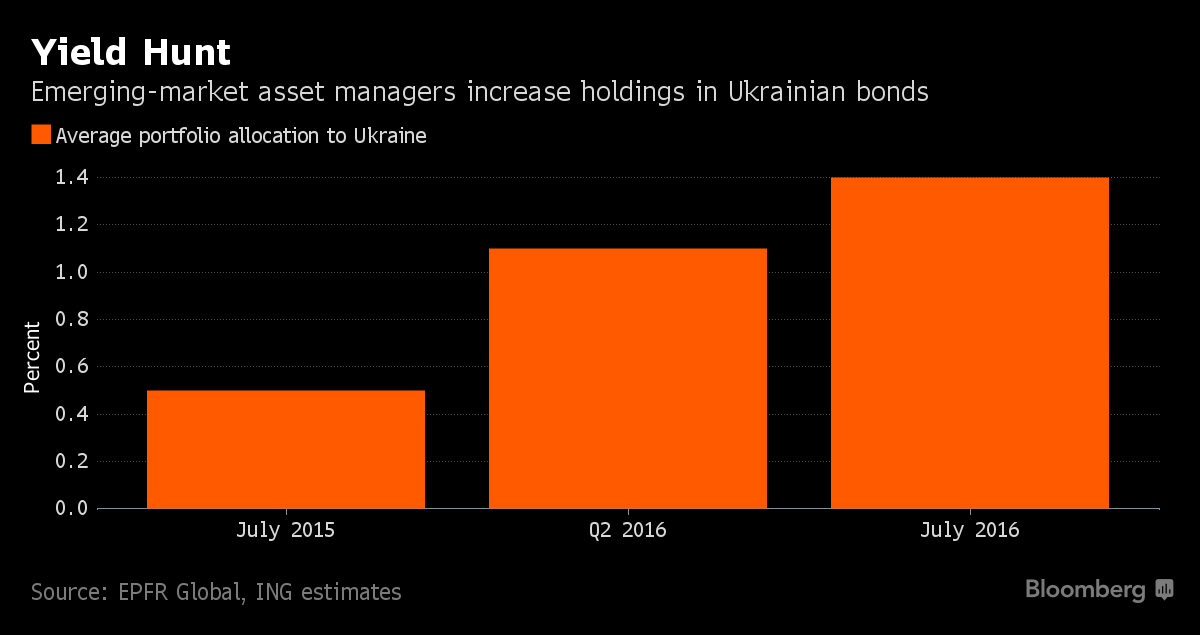 Украинские облигации выросли на 14% до конца июля, когда инвестиционные фонды увеличили вложения в развивающихся рынки почти в три раза в погоне за более высокой доходностью. На Украину приходилось 1,4% их портфелей облигаций в конце июля, что соответствует вложениям в бумаги Индии, Казахстана и Румынии, говорится в аналитической записке, подготовленной ING Groep NV в этом месяце.