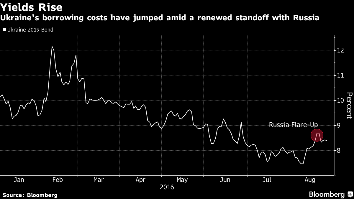 Тем не менее, горячие деньги потекли в другом направлении, когда президент РФ Владимир Путин обвинил Украину в терроризме в Крыму, а украинский лидер Петр Порошенко предупредил о возможном вторжении со стороны России. Доходность бумаг с погашения в сентябре 2019 года подскочила на 50 базисных пунктов до 8,42% в августе, продемонстрировав самый большой месячный рост начиная с февраля, когда отставка министра экономики показала растущие проблемы в правительстве.
