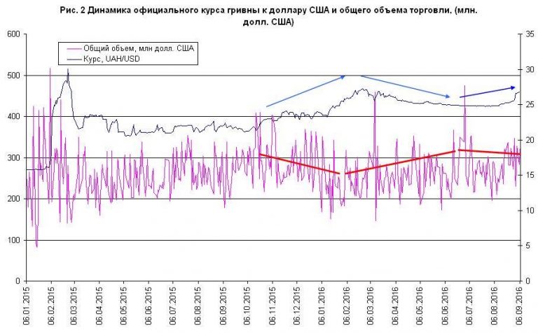 Если посмотреть более длинный горизонт - весь 2015 год и 8 месяцев 2016 года, то улавливается общий тренд: при росте объемов торговли на межбанковском рынке курс доллара к гривне падает, и наоборот. С февраля по начало июня на межбанке был явный рост объемов торговли - и курс с 27,01 ушел до отметки ниже 25,0. С конца июля и по первую декаду сентября объемы торговли начали падать и курс доллара подрос до 26,84, т.е. почти вернулся на февральскую отметку (рис. 2).