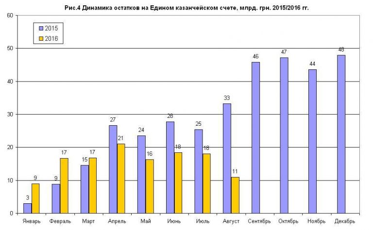 Емкость рынка ОВГЗ (облигаций внутреннего госзайма) также не исчерпана. Т.е. даже самые негативные оценки не пугают. Зато пугает новогодняя перспектива. Зависшие 38,2 млрд грн плюс эффект накопления средств на Едином казначейском счете (ЕКС) могут опять привести к ситуации 2015 года, когда в конце декабря нужно срочно потратить деньги. В отличие от Арсения Яценюка Владимир Гройсман на ЕКС средства пока не накапливает, за 8 месяцев 2016 года мы только дважды (в феврале и марте) превысили прошлогодние остатки на ЕКС. Однако у нас впереди еще 3,5 месяца. Поэтому "бюджетный риск" при прогнозировании валютных курсов стоит держать на контроле (рис. 4).