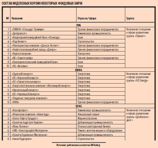 И все же анализ состава некоторых индексных корзин указывает на связь бирж с рядом финансово-промышленных групп. Перечни компаний, которые входят в состав индексов разных бирж, очень отличаются. «Если рассматривать корзину ПФБ и ВЕФБ, то можно отметить, что в состав расчета индекса включены акции предприятий разных отраслей и сфер, также прослеживается региональная принадлежность участников (Днепропетровск и Донецк соответственно)», — рассказывает начальник отдела стратегического развития рейтингового агентства «IBI-Rating» Игорь Андрусик. Но в случае с КМФБ практически вся индексная корзина состоит из предприятий энергетической отрасли и отсутствует региональный фактор.