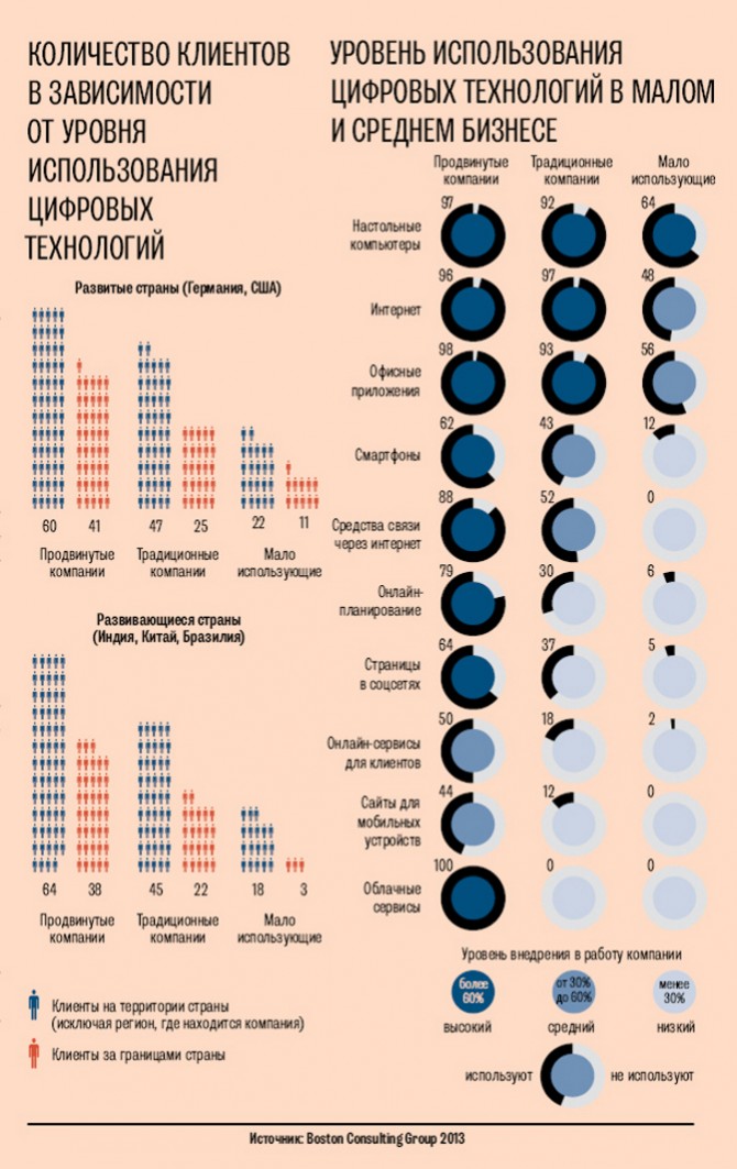 А малые и средние компании, не придающие особого значения цифровым технологиям, широко используют только настольные компьютеры, интернет и офисные приложения, абсолютно игнорируя средства связи через интернет, сайты для мобильных устройств и облачные сервисы.
