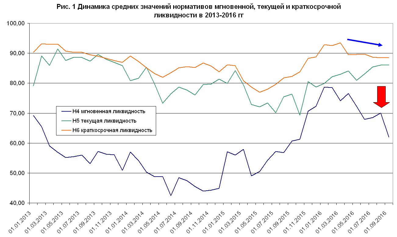Первый этап — накопление. Банковская система страны уже успешно прошла этап накопления ликвидности. Причем пик накопления приходился примерно на февраль-март 2016 года. Это видно по пиковым значениям Н4 и Н5 (рис. 1). Далее мы видим очень яркий тренд по снижению средней мгновенной ликвидности с 78,73% до 62,01%. Норматив Н4 нам сигнализирует, что банки стали что-то делать с избытком ликвидности, и по значению Н4 мы внезапно попадаем аж в март 2013 года — как раз когда С.Г. Арбузов успокоил валютный рынок и тоже плавно сбивал избыток ликвидности в системе.