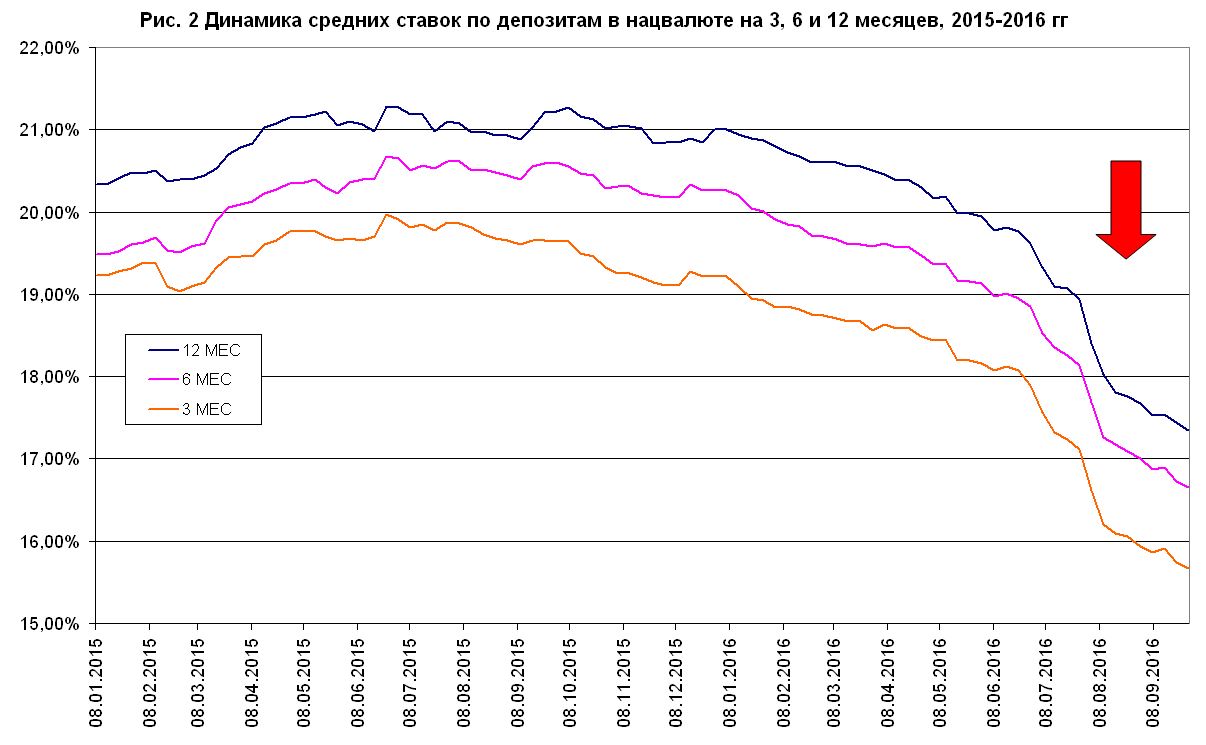 Второй этап — жадность. Этот этап характеризуется осознанием банкирами, что кубышку с ликвидностью надо распечатывать и раздавать кредиты. Как раз летом мы вошли в данный этап. Это видно по нормативам ликвидности и по новостям банков, но еще не видно по статистике кредитного портфеля из-за падения качества активов. Добившись макростабильности, НБУ снижает учетную ставку, а вместе с ней падает и доходность по «безрисковым инструментам» в активах банков. К сожалению, достойной доверия средней по рынку кредитной ставки у нас нет, так как ее искажает комиссия банков. Поэтому то, как падали рыночные ставки, можно проследить на примере депозитных ставок (рис. 2).