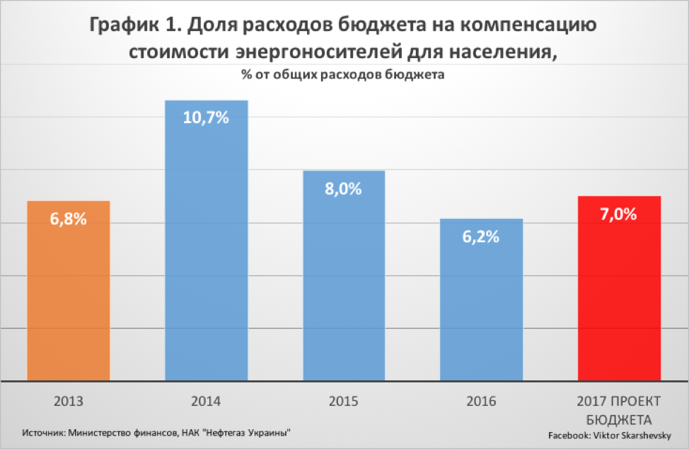 Тарифы на газ для населения и тепло начали резко повышаться с 2014 года. При этом, расходы бюджета после семикратного повышения цены на газ и тепло для населения, не то, чтоб не уменьшились, как утверждает Владимир Гройсман, а, наоборот, увеличиваются (!) — с 6,8% от общих бюджетных расходов в 2013 году до 7,0% в 2017-м (см. График 1).