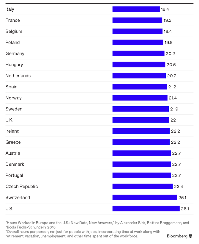 Новое исследование, данные которого приводит Bloomberg, попыталось ответить на вопрос, насколько в целом американцы работают больше, чем европейцы? Получилось, что в среднем человек в Европе работает на 19 процентов меньше, чем его коллега в США. Это примерно на 258 меньше часов в год, или на час меньше каждый рабочий день. Другой способ посмотреть на эти данные: работники в США проводят на работе почти на 25 процентов больше часов, чем европейцы.