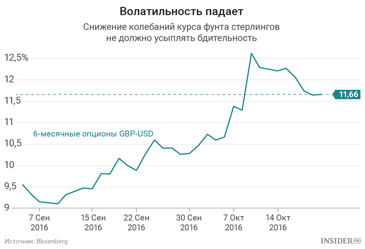 Луканьо Мньянда из Bloomberg пишет, что фунт переживает период относительной стабильности, но это не должно обманывать трейдеров. Хотя на прошлой неделе показатель ожидаемой волатильности упал, прогноз по колебаниям фунта стерлингов на ближайшие полгода по-прежнему выше, чем у любой валюты, входящей в «Группу десяти».