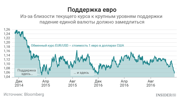 Это не означает, что движение евро будет односторонним. В настоящий момент единая валюта стоит около $1,0636, а из графика выше заметно, что главная поддержка лежит на $1,05 — с начала прошлого года евро колеблется в диапазоне $1,05−1,16. В скором времени поддержка может быть протестирована. Существуют и другие факторы в пользу евро. Из истории Бундесбанка мы знаем, что он выступает за сильную валюту и считает ее неотъемлемым элементом жизнеспособности союза. Немцы наверняка надавят на Драги и остальное руководство ЕЦБ, чтобы предотвратить ее чрезмерное ослабление. Однако даже этого может быть недостаточно.