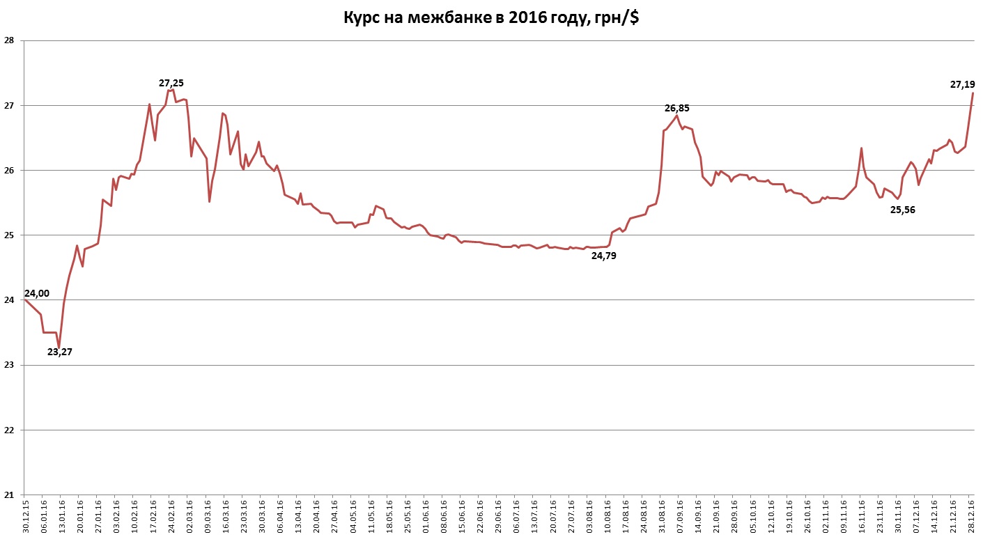 Декабрь 2016 года прошел под эгидой девальвационного тренда. За месяц доллар подорожал на межбанке на 6,4%, притом что за весь минувший год американская валюта к гривне повысилась в цене «всего» на 13,3%. Из этих цифр может сложиться ложное впечатление, что национальная валюта в течение года медленно обесценивалась, а в декабре ее девальвация лишь ускорилась.