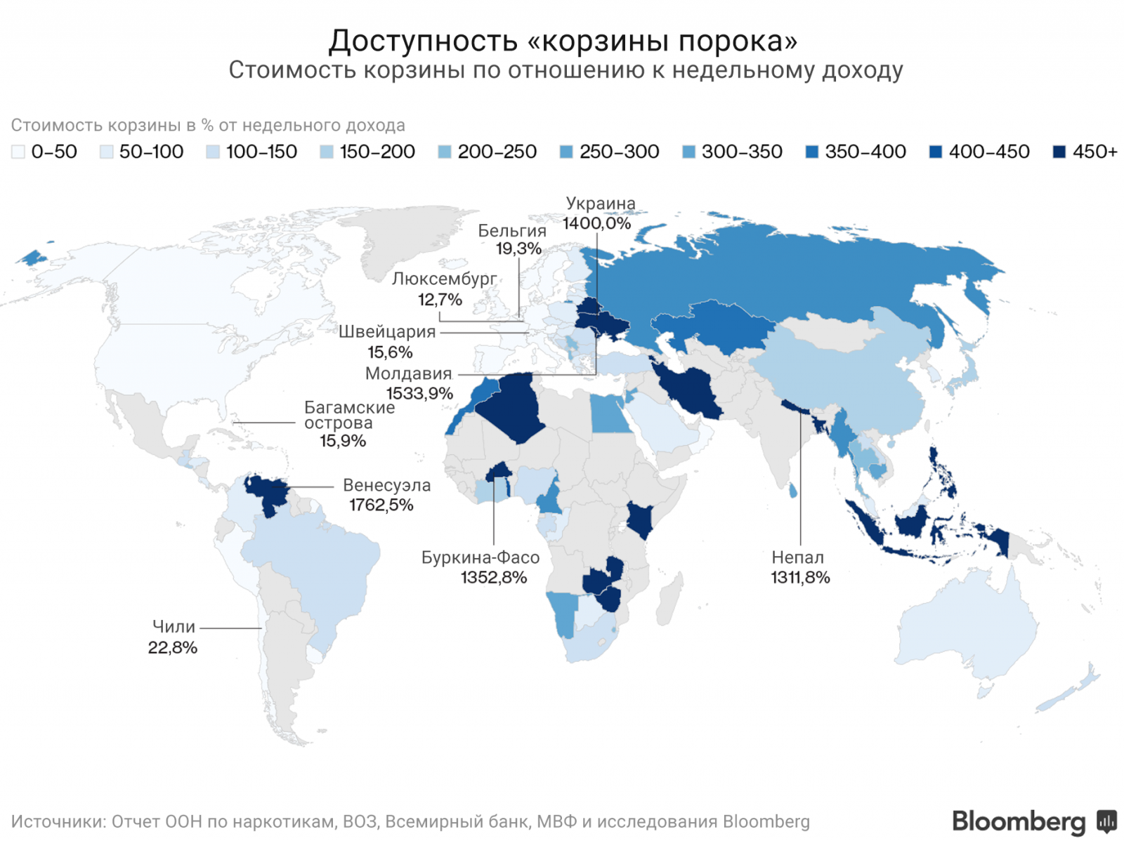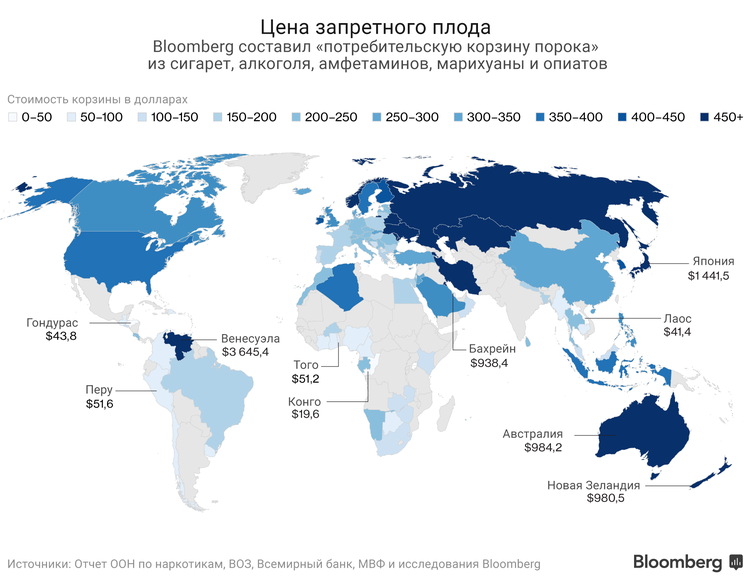 Издание сравнило цену «потребительской корзины», состоящей из табака, алкоголя, амфетаминов, марихуаны, кокаина и опиатов, в более чем 100 странах, выбрав в качестве точки отсчета США, где подобный набор обойдется в $400, или около трети среднего недельного дохода.