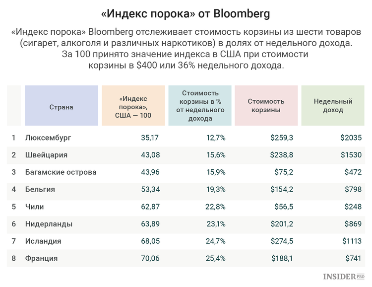 Если сравнивать стоимость корзины с доходами, открываются некоторые сюрпризы. С этой точки зрения лучше всего ситуация в богатых странах, Люксембурге и Швейцарии. В Венесуэле же безудержная инфляция привела к тому, что местные жители вынуждены тратить на удовлетворение своих вредных привычек — пачку сигарет, бутылку пива и грамм кокаина — около 17 недельных зарплат.