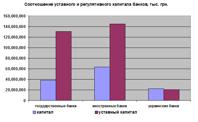 Следующий график показывает соотношение уставного и регулятивного капитала банков. Как мы помним, «Базель-3» существенное внимание уделяет структурным элементам капитала и его «подушкам» безопасности. Как видим на графике, ни о каких дополнительных уровнях капитала в Украине речь не идёт. Более того, в группе государственных и иностранных банков наблюдается существенное превышение уставного капитала над регулятивным (а должно быть наоборот). Уставный капитал — корневой в системе учёта базиса устойчивости банка. К нему добавляются дополнительные элементы и в итоге формируется сумма регулятивного капитала. В данном случае под воздействием убытков в процессе убыточной деятельности, а также вследствие формирования резервов по проблемные активам произошла существенная эрозия регулятивного капитала, и он стал меньше уставного. Только украинские банки смогли обеспечить соответствие «уставника» и регулятивного капитала.