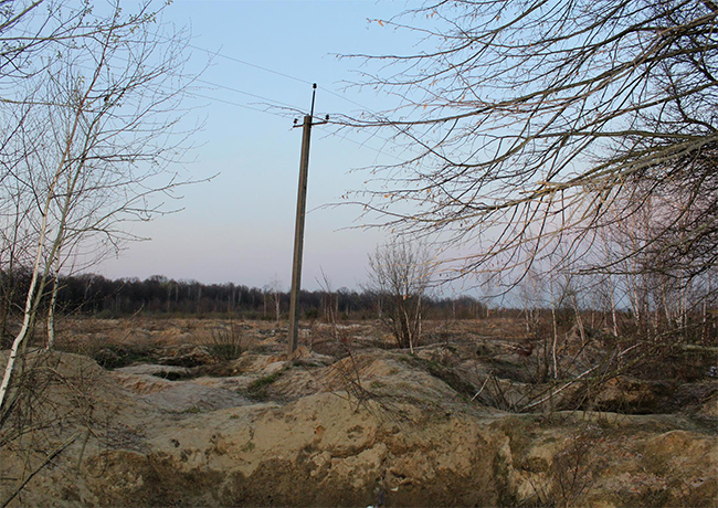Было очень много машин. Сейчас копателей там нет. Однако в лесу вблизи хорошо слышно гудение насосов, которые громко перекликаются с пением птиц. Узкой, но асфальтированной дорогой можно пройти на территорию Дубровицкого лесничества и увидеть разрушенные участки леса, водоемы, а также различные надписи, такие как например «Продаю буры» или «Сдаю в аренду экскаватор».