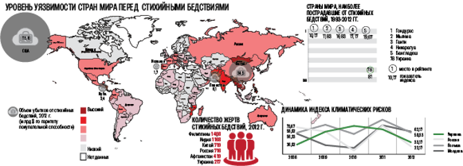 По уровню уязвимости к стихийным бедствиям Украина расположилась на 23 месте среди 181 страны мира. Об этом свидетельствуют данные девятого ежегодного отчета «Глобальный индекс климатических рисков 2014», подготовленного экспертами немецкой неправительственной организации Germanwatch при финансовой поддержке Федерального министерства экономического сотрудничества и развития Германии.