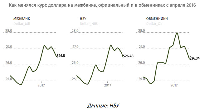 Спекулянты, будто ожидая туристов в преддверии Евровидения, торгуют валютой ниже уровня межбанковского рынка. Продать валюту в обменных пунктах можно по 26 грн за долл, купить — по 26,3 грн за долл, хотя в начале 2017 года национальная валюта на «черном рынке» торговалась по цене около 30 грн за долл.