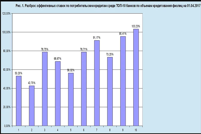 Как следует из данных мониторинга, эффективная ставка по потребительским кредитам среди ТОП-10 наиболее активных в розничном секторе банков колебалась в марте-апреле 2017 года в диапазоне от 42,7% до 103,23%. Средний размер эффективной ставки по активным банкам составлял 74,14%.