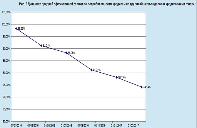 Справедливости ради скажу, что с января 2016 года средняя эффективная ставка на этом рынке регулярно снижалась. По моим оценкам, январь 2016 года мы встретили со средней эффективной ставкой 98,25%, за март 2017 года на рынке эффективные ставки по этим видам кредитов сползли до 74,14%. Такое явное и заметное снижение произошло во многом благодаря макроэкономической стабилизации, однако его недостаточно, чтобы запустить механизм, стимулирующий рост потребления и экономики.
