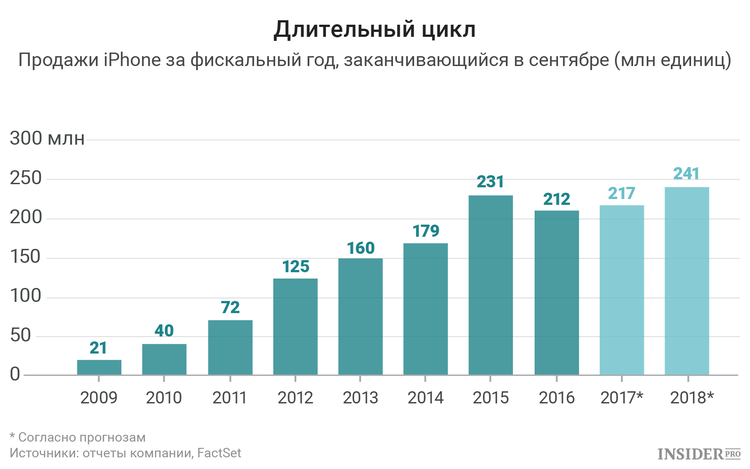 Согласно прогнозам Уолл-стрит, в 2018 финансовом году Apple продаст 241 млн iPhone, который станет началом нового цикла обновления смартфона. Это на 11% больше по сравнению с продажами, прогнозируемыми по итогам текущего финансового года (217 млн устройств). Цифры кажутся вполне правдоподобными, поскольку множество пользователей iPhone откладывают покупку, ожидая выхода восьмой модели.