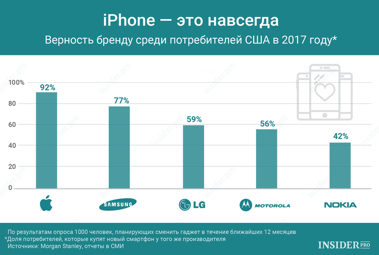 Apple старается постоянно повышать уровень лояльности своих пользователей. Недавнее исследование Morgan Stanley показало, что 92% нынешних владельцев iPhone испытывают привязанность к бренду и планируют покупать только смартфоны Apple (по сравнению с 86% в прошлом году).