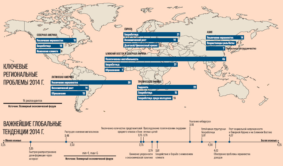 Основная цель исследования — попытка очертить, опираясь на экспертное мнение, глобальные проблемы, которые окажут значительное влияние на обстановку в мире в течение следующих 12‑18 месяцев. Согласно прогнозам ВЭФ, среди наиболее приоритетных направлений деятельности мировых лидеров в 2014 г. — решение проблемы разницы в доходах и борьба с высоким уровнем структурной безработицы.