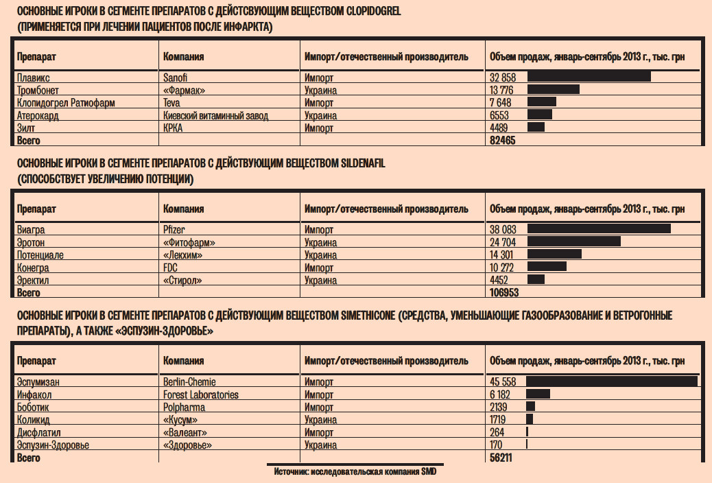Украинские фармкомпании уже научились копировать популярные иностранные лекарства, а продавать препараты — нет. Отечественный производитель «Фитофарм» вывел в конце 2011 г. на рынок препарат «Эротон» — копию «Виагры» (выпускает Pfizer), а в 2013 г. украинский аналог по объемам продаж почти догнал оригинальный препарат.