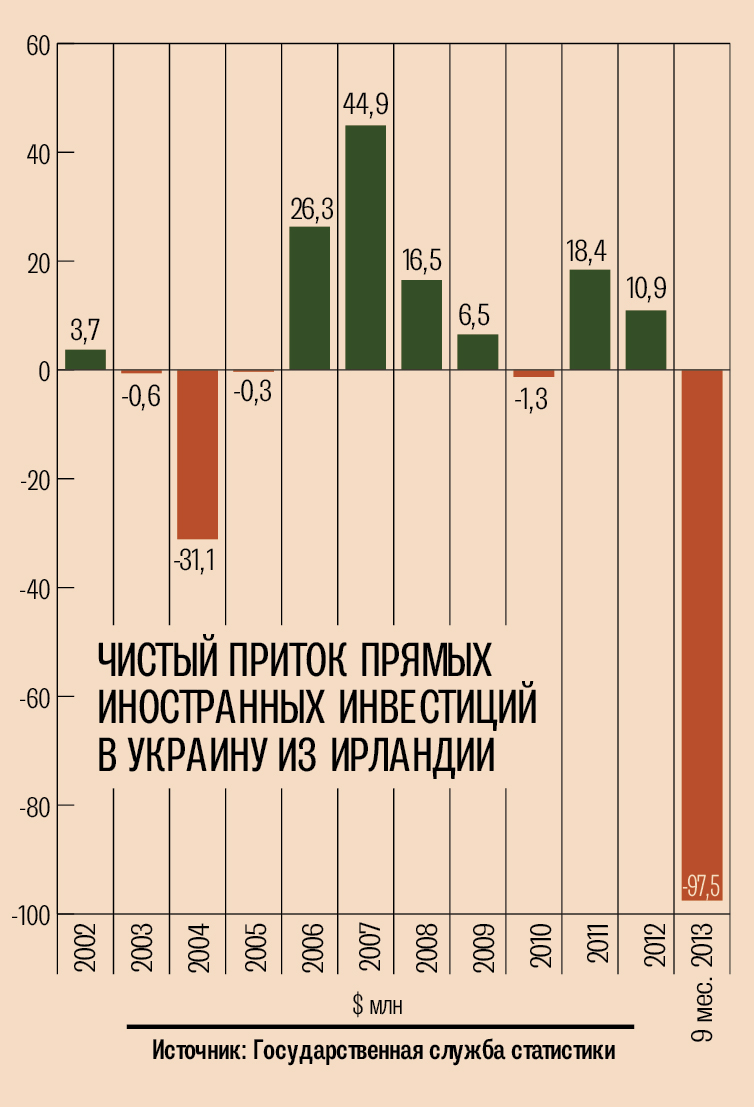 По данным Государственной службы статистики, с момента обретения Украиной независимости до начала октября 2013 г. в нашу страну из Ирландии поступило лишь $ 70,6 млн прямых иностранных инвестиций. Для сравнения, из Кипра в Украину за это время поступило $ 18,7 млрд ПИИ, из Нидерландов — $ 5,5 млрд, с БВО — $ 2,5 млрд, из Белиза — $ 1 млрд.